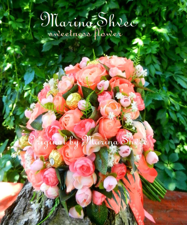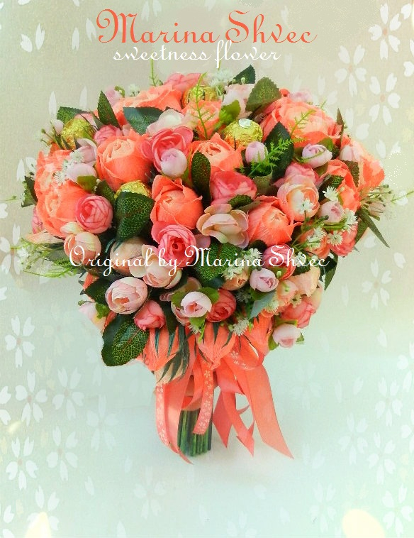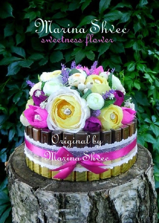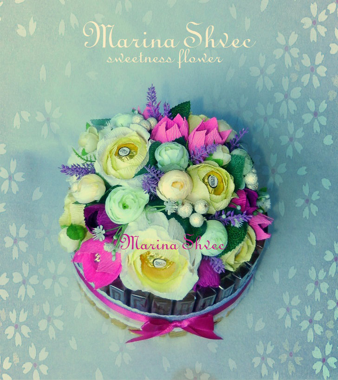 Работы восхитительны!Букет ручной,такой нежный,такой воздушный.Мой любимый цвет роз-персиковый или коралловый.Тортик хорош,сочетание лилового и беж,всегда на отлично.