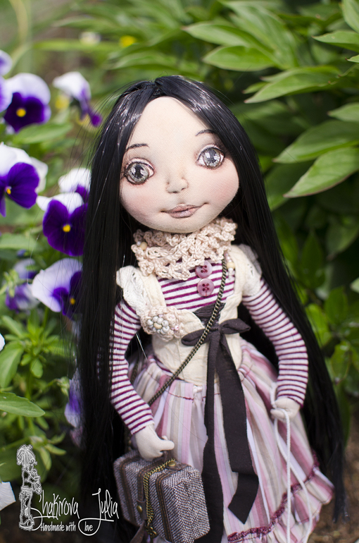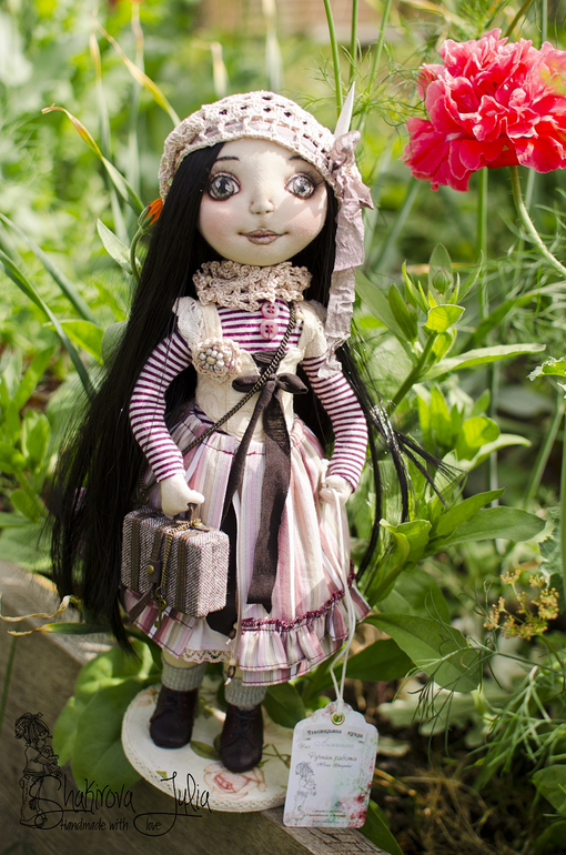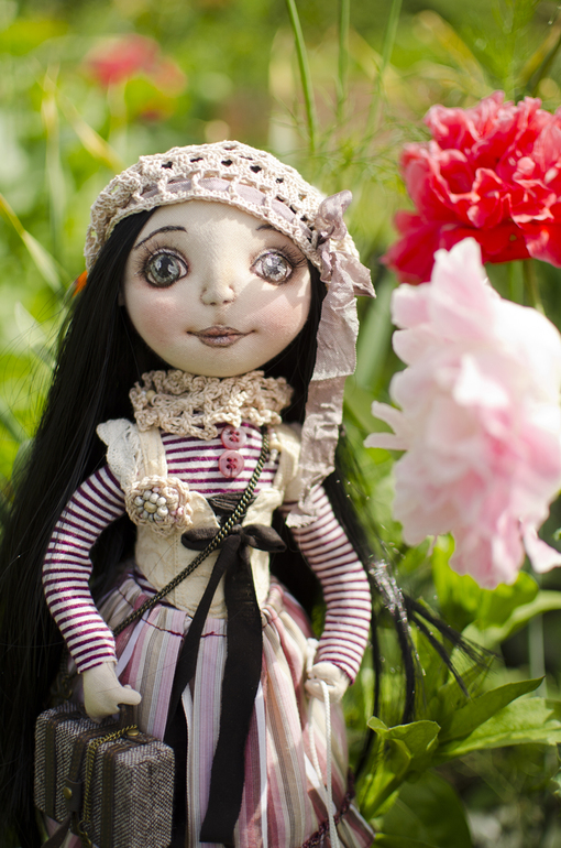 Здравствуйте,дорогие мои рукодельницы!Давно смотрела на одну из моих первых куколок-и понимала,что не устраивает..Голова!Одежда очень нравится,даже теперь.спустя год,но голова не на уровне...Тем более,давно зрела мысль сделать головку в новой технике-без шва по середине.И я решилась на переделку.Теперь я очень довольна результатом,голова выполнена в сложной технике,с приваливанием выпуклых частей,и обтянута трикотажем.Ручки тоже поменяла-сделала трикотажные,все пять пальчиков теперь присутствуют,и конечно сгибаются.Сама держит чемоданчик,который можно открыть.Прошу под кат,кому интересно увидеть все фото!))