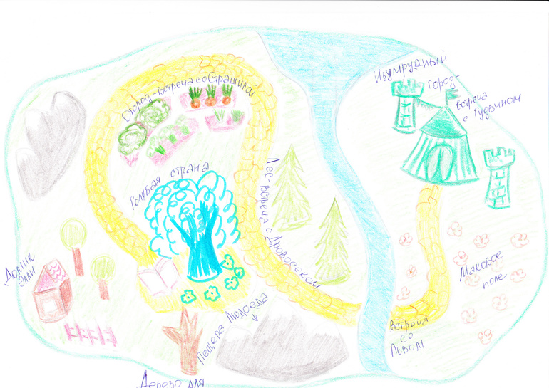 Ну с масштабом я, конечно, могла намудрить, но это только идея. Все элементы объёмные, в пещере живёт Людоед, в городке — Гудвин. Ещё не представляю, как сделать волшебную книгу, но главное начать)))