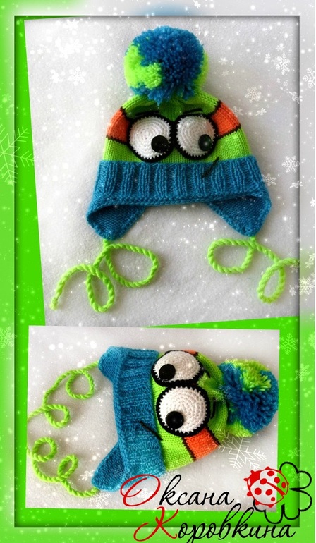Оля)я вяжу всё без схем)рассчитываю по ходу...уже на глаз)тут всё просто...подворот резинкой 2 на 2..затем несколько рядов салатным цветом...один ряд коричневым...полоска оранжевая..опять один ряд коричневый и снова салатный до нужной глубины шапочки...дальше провязали по 2 петли вместе(весь ряд)и стянули)))глазки это кружки ст.б.н...а ниточки ОЛЬГА семеновская..в 2 сложения,кроме оранжевой..это по моему меринос от пехорки....да не важно)главное цвет и состав подходящий...ну и метраж примерно...