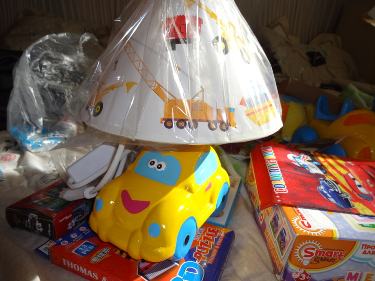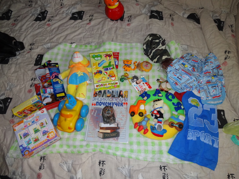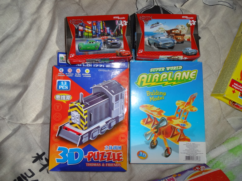 Но Ксюша, конечно, на этом не остановилась и прислала кучу подарков - одежки и кепку, прекрасную энциклопедию, 3Д пазлы (паровоз собрали перед сном - стоит в изголовье кровати :)), мемори для мальчиков, вкусности, фляжку для активного отдыха с паровозиком Томасом (ура, наконец-то фляжка у Васи появилась, с года хотел :) ), раскраски с Маквином и наклейками, с человеком-пауком салфетки, офигенный светильник-машинка и на плафоне тоже транспорт! В общем - всего не перечесть!!! О, лев плюшевый спит с Васей уже :) Носочки теплые, тоже Ксюшиных рук дело :) Наклейки интерьерные объемные, вот разгуляемся с Васей лепить!