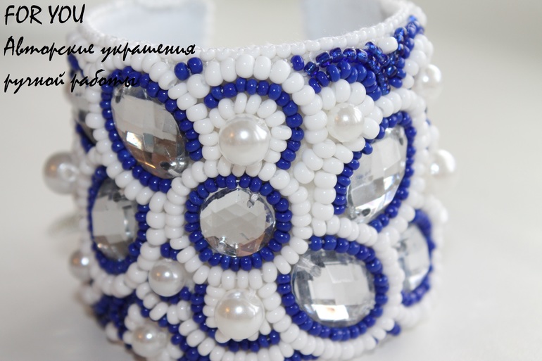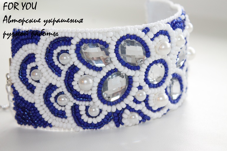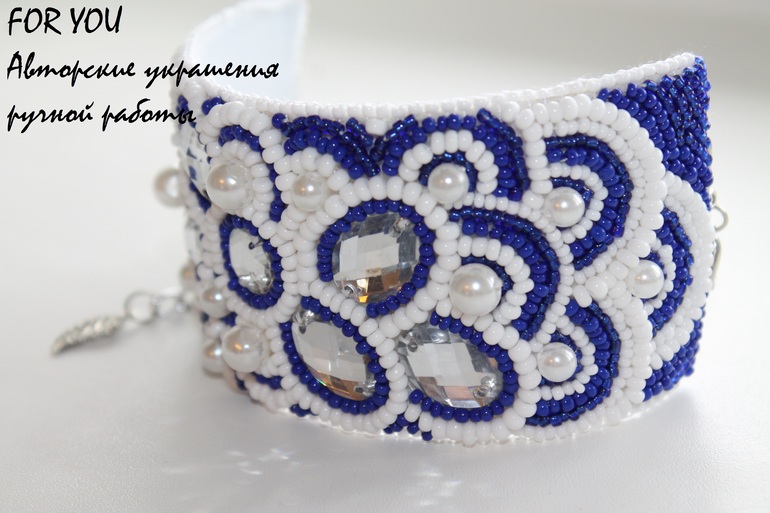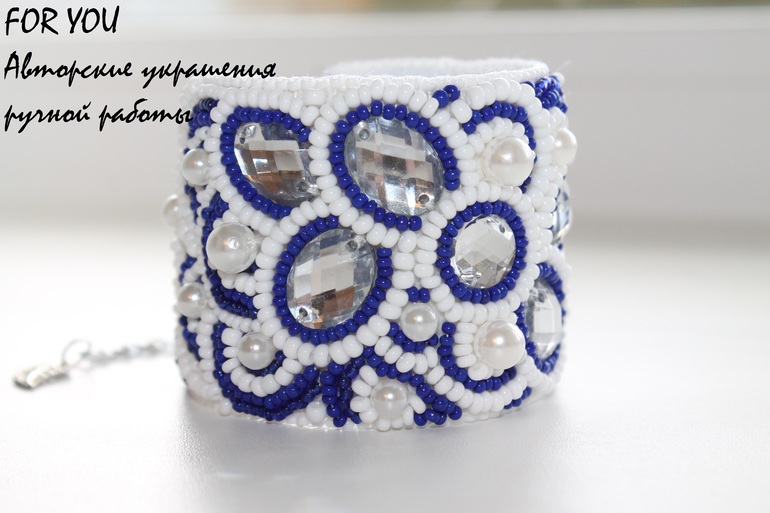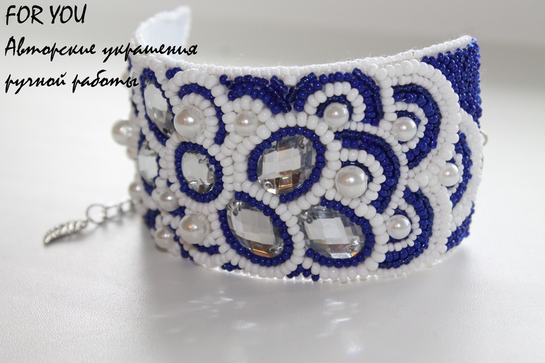 Браслет выполнен под заказ. Белый цвет смотрится эффектнее всего подчеркивает глубину и насыщенность синего. Бело-синие сочетания сегодня на пике моды, они позволяют создать милый, романтичный образ и подчеркнуть ваш стиль.