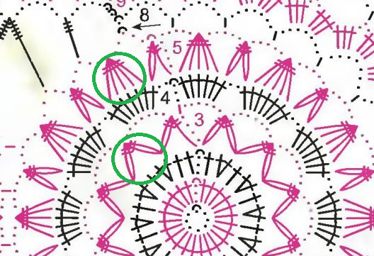 в пятом ряду, если я не ошибаюсь, 5 столбиков с двумя накидами с общей вершиной, а в 3м ряду два столбика с 2мя накидами провязаные в одну петлю и через две петли такие же 2а столбика с двумя накидами в одну петлю, и все четыре с общей вершиной, надеюсь понятно объяснила