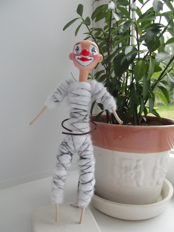 Это начало пути... головка, ручки и башмачки слеплены из запекаемой глины Фимо. Разрисован акриловыми красками. Тело на каркасе, обмотано синтепоном. Уже клёвый!