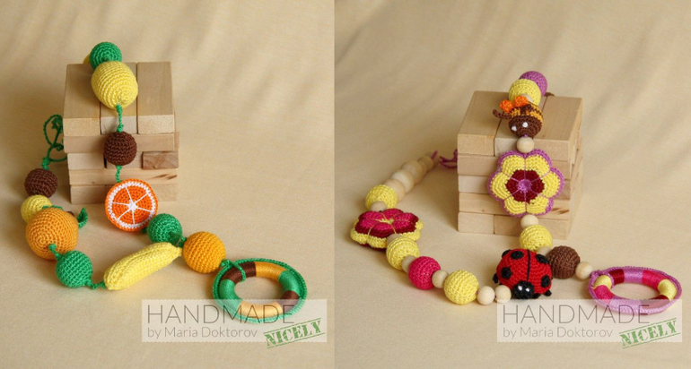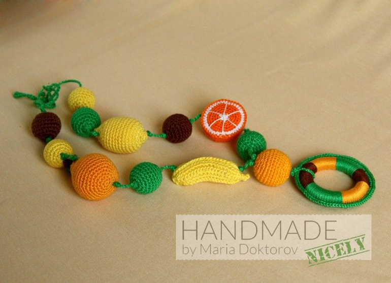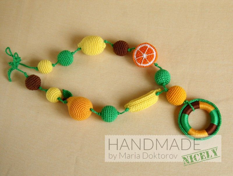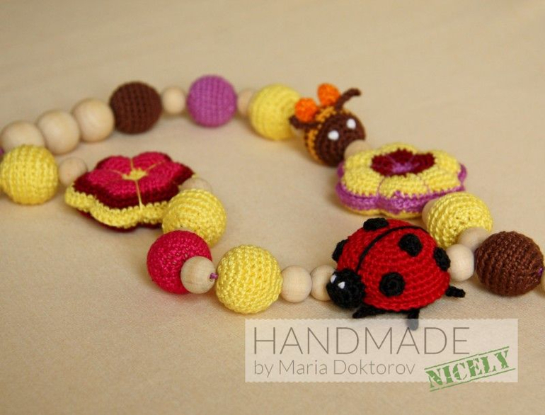 Спасибо! Их, конечно, можно использовать и как обычные бусы для ребенка, но вообще они для мамы. Главная их задача — это занять ребенка. Например, когда я кормила дочь грудью, она меня всю издергивала, ей явно было некуда девать руки :) Я одевала такие бусики и дочка трепала бусы, а не меня. Так же, я их одевала, когда носила дочку в слинге (отсюда и название — слингобусы). Второе применение слингобус — это отличный прорезыватель зубов. Бусы сделаны из натурального необработанного дерева и 100% хлопка, игрушки набиты антиаллиргенным наполнителем. Так же, бусы являются развивашкой для малыша. Они развивают мелкую моторику (разные текстуры, мягкие и твердые елементы), цветовосприятие, дают понятие о разных формах. Вот.
