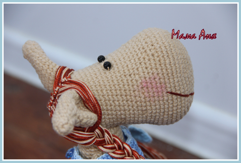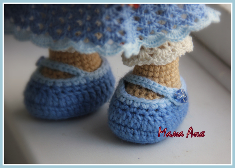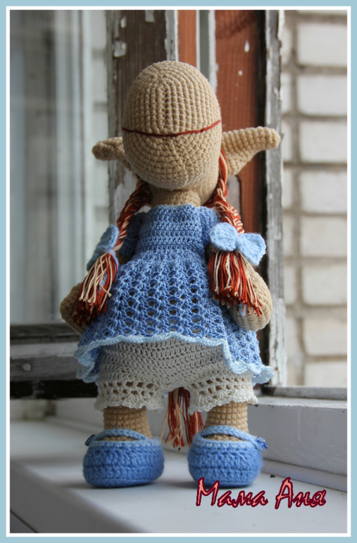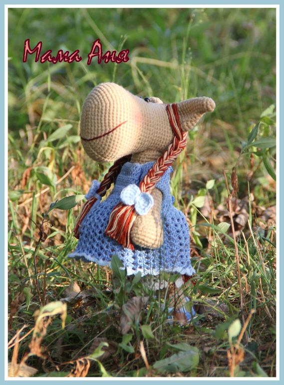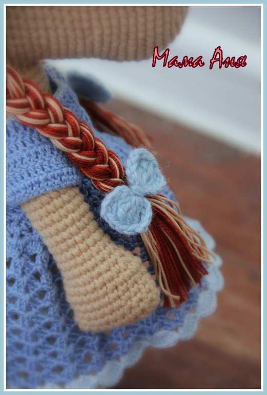 Связана крючком из пряжи YarnArt Jeans (55% хлопок, 45% полиакрил), YarnArt Lily (100% хлопок). Наполнитель - синтепон. Рост около 25 см. Самостоятельно сидит и стоит.