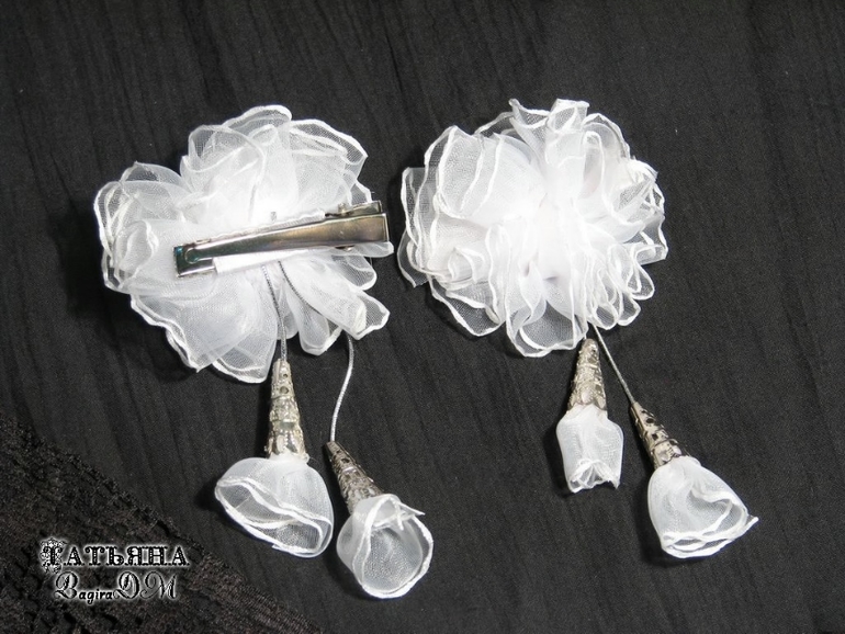 Вот такие маленькие с висюличками, очень нежные) Диаметр 6 см, длинна с колокольчиками - 12,5 см, заколка-уточка 4,5 см.