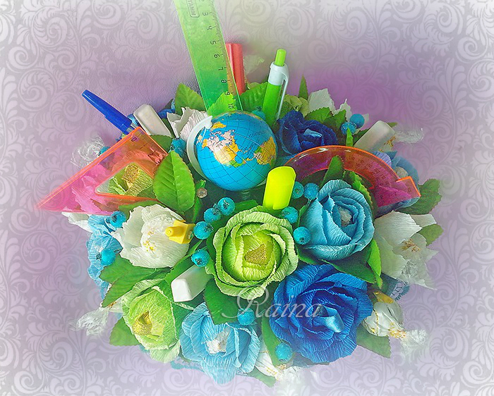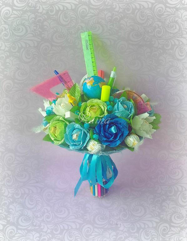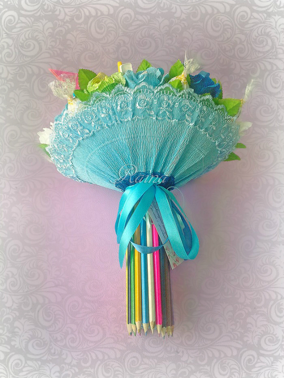 Мне ваше цветовое решение понравилось в сочетании с идеей, в том смысле что не осенние оттенки, которые обычно используют в таких букетиках! Тоже в планах такой букетик дочке в школу, но вот с цветом ещё не определилась...