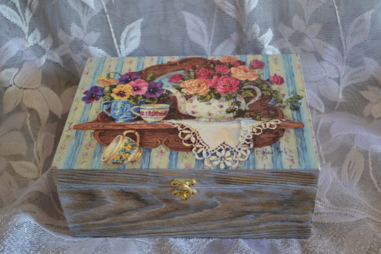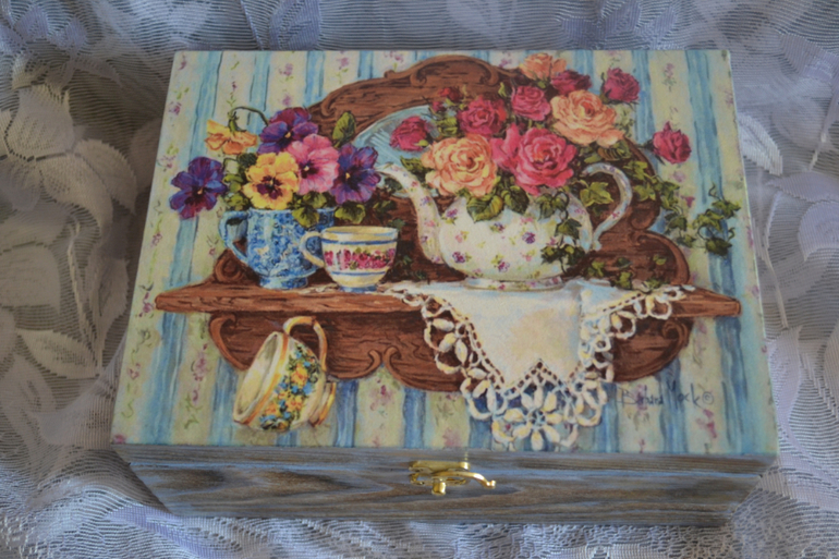 ДекупажОчень понравилась эта картинка, незабудки и розы восхитительны и вот они на моей шкатулочке для чайных пакетиков!