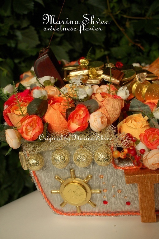 От клиентки поступил заказик на празднование 18-летия компании "ТрактТерминал" на корабль в метр длиной на 81 розу с Ферерро и 1,5л шампанским. Да так, что бы каждому гостю на праздновании юбилея раздать по цветочку, соответственно съемные. Сначала была мысль отказаться, т.к. корабли я ни разу не делала, почти)) один был папе на юбилей, но сфотографировать уже не успела( Вобщем я согласилась, и понеслось...