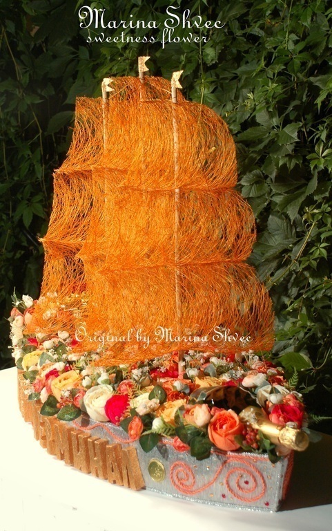 Цвет компании оранжево-стальной... сам корабль стал серебренным, а розы и паруса оранжевые. Надпись делала из пеноплекса и оборачивала в оранжевую металлизированую гофру. Почти 1,5 недели работы, последние 3 дня и 4 ночи без сна, и вот он)))