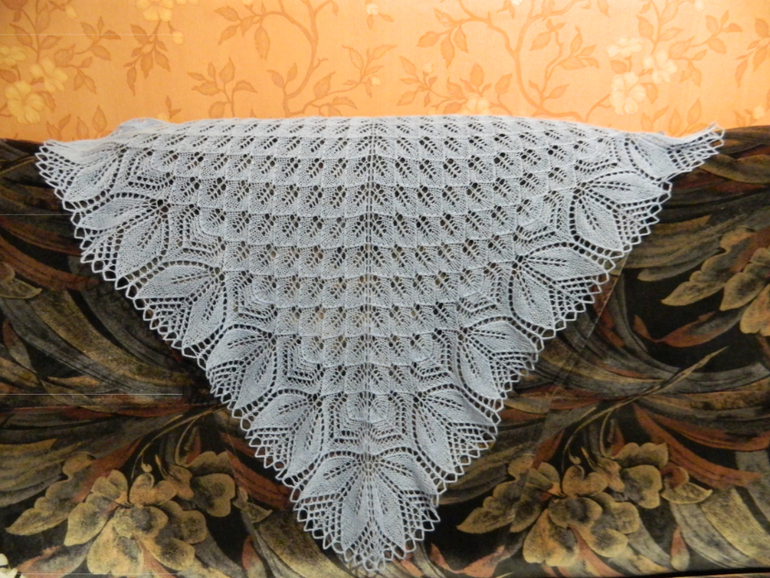 Спасибо! =))Вот и у нас нет особо ниток (( прям глухо, особенно с цветами.. Сейчас вяжу совсем другую шаль из ниток потолще (500 м/100 гр, 40% мохера), потом выложу, как закончу. Главный вопрос к каждой пряже для шали — держит ли она блокировку.. Если красивый узор связать из синтетики, то потом можно долго печалиться, что рисунок не расправился =) если будете выбирать, смотрите ниточку с большим содержанием шерсти =) Если есть в вашем магазине Вита Элегант, можно попробовать эту шаль из нее =) там 400 м/100 гр, но шерсти аж 70%. Думаю, как растянете, так и застынет узор, словно заморозится =)) я обязательно из этой пряжи такую шаль свяжу попозже =)