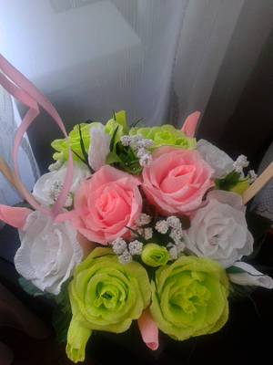 Сначала решила салатовый и белый взять цвет......букет показался грустным... разбавила розовым. Бутоны уже укоротила.