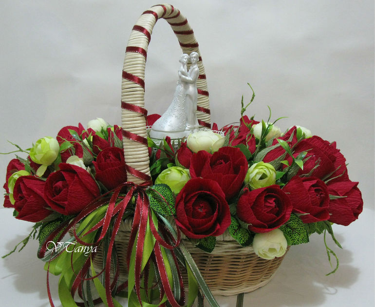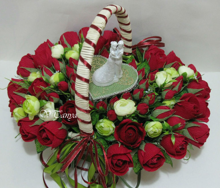 И корзина Свадебная. С ней отдельная история... Думала сделаю за неделю, а оказалось нужна за два дня. И в самый ответственный момент закончилась бумага... а такого оттенка у нас в городе и нет! Рулон разошелся весь... вместо роз появились бутоны... Но в целом я думаю не очень плохо? Что скажите?