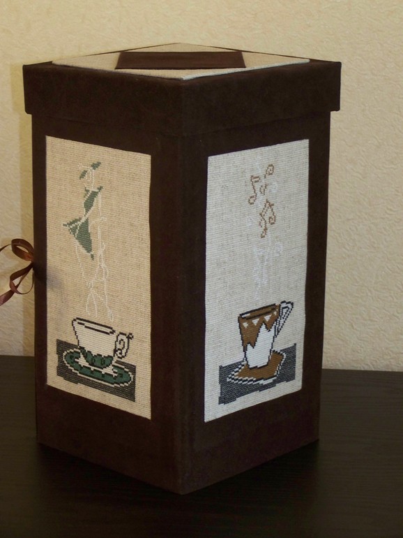 Эту коробку сделала еще в прошлом году и она уже радует своего владельца (очень надеюсь)). Когда-то очень захотела вышить эти картинки, а потом не знала как их применить. И вот пришла идея)). Внутренняя часть оформлена в стиле декупаж. Три отделения для чайных пакетиков и одно для сладостей и сахара.
