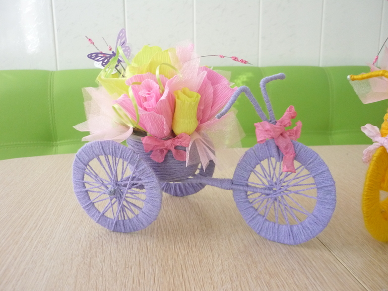 Есть скучная кухня (в дневнике) решила добавить ярких красок. Сделала сначала желтый велосипедик, потом придумали с сыночком повторить в детский сад. И так мне понравился сиреневый велосипед, что отдавать не хочу!!! Придется делать третий. Как вам такая идея декора?