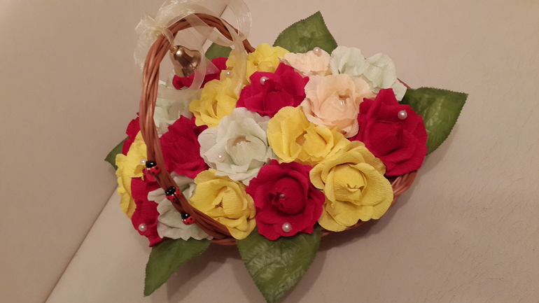 розочки отличные, но им немножко тесновато в корзине, и зелени добавить точно. бантик попышнее и разноцветный сделать:)