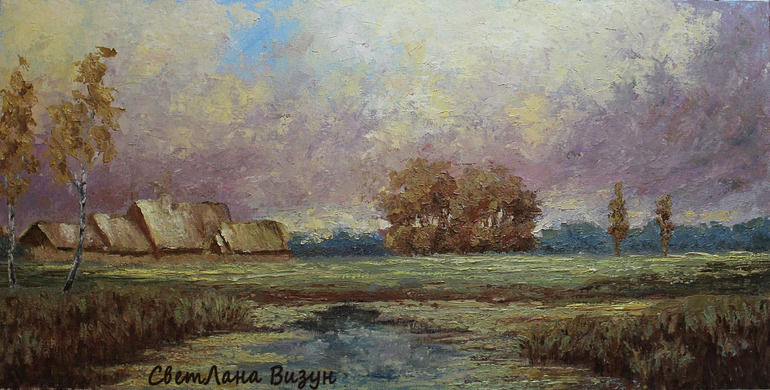 красивая картина.Мне все твои работы нравятся.Хотя я бы такую не повесила дома,потому как меня угнетают такие оттенки,вообще я осень вижу на этой картине,а осень не люблю )))) но как ты работаешь,как накладываешь мазки,и это небо,и эта трава... просто загляденье
