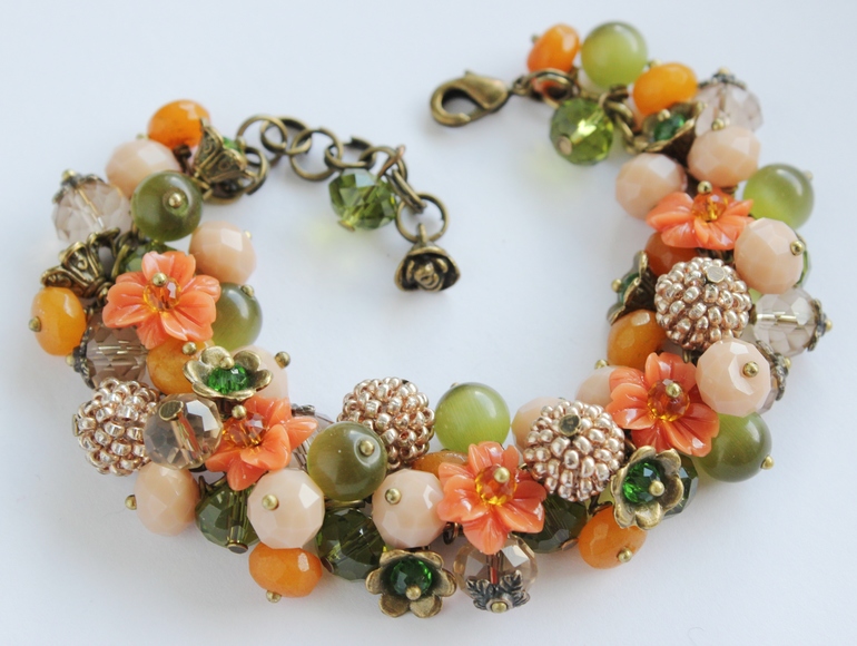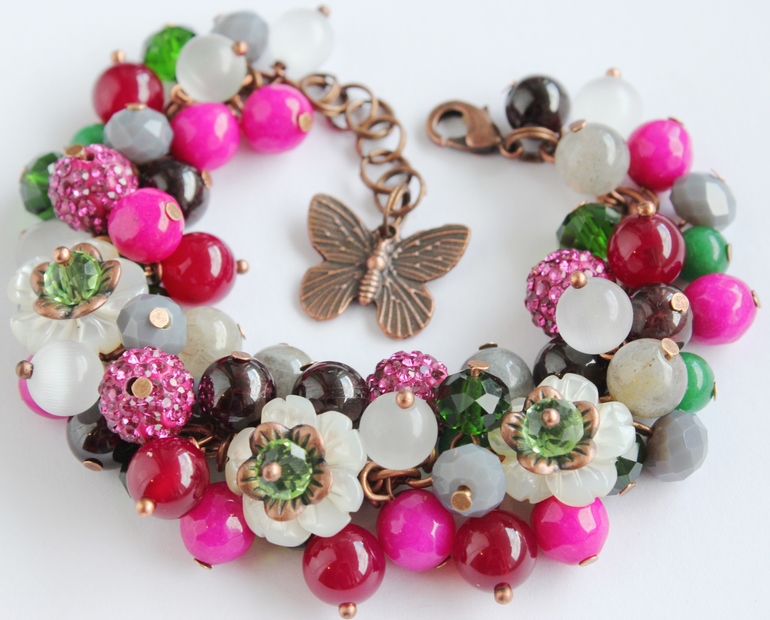 7) Браслет "Лето" выполнен из агата, граната, кошачьего глаза, стразовых бусин, перламутровых цветков, гранёных бусин и фурнитуры под медь.
