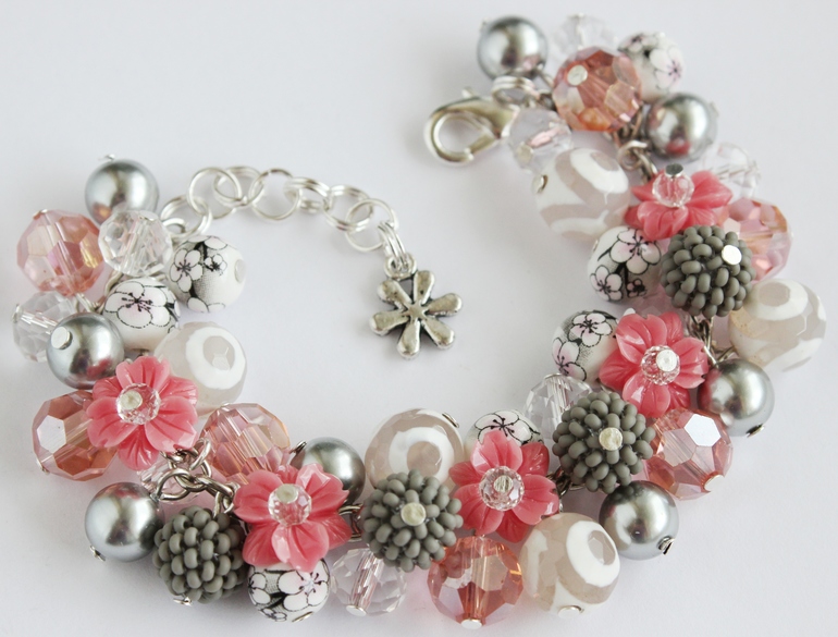 6) Браслет "Серебристо-розовый" выполнен из бусин, оплетённых чешским бисером, агата Дзи, жемчуга майорка, керамических бусин, гранёных бусин, акриловых цветочков и фурнитуры под серебро.