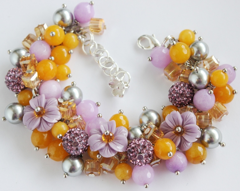 5) Браслет "Жёлто-сиреневый" выполнен из агата, гранёных бусин(имитация сваровски),жемчуга майорка, стразовых бусин, акриловых цветков и фурнитуры под серебро.