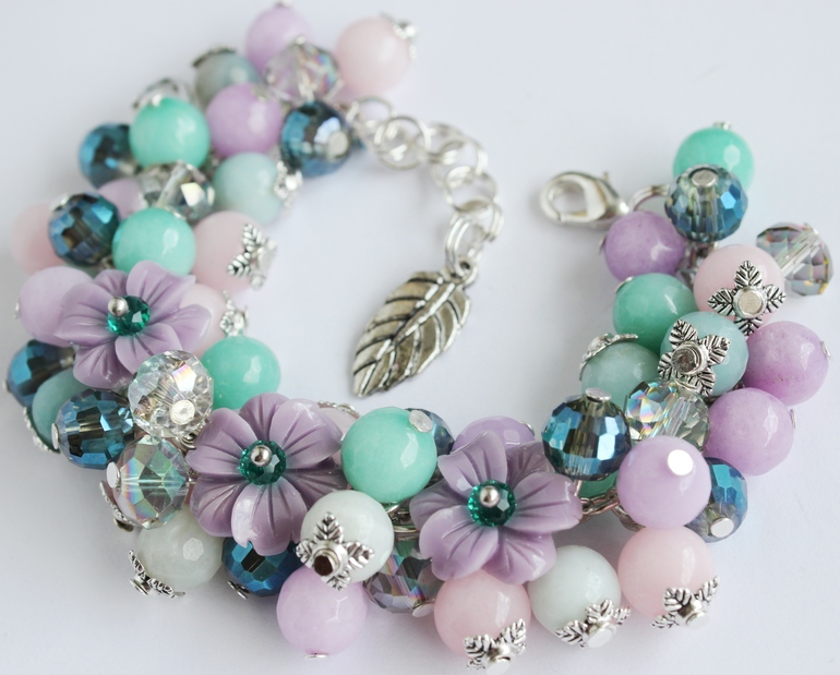4) Браслет "В стране цветов" выполнен из агата, агата кракле, перламутровых цветков, стразовых бусин, гранёных бусин и фурнитуры под серебро.