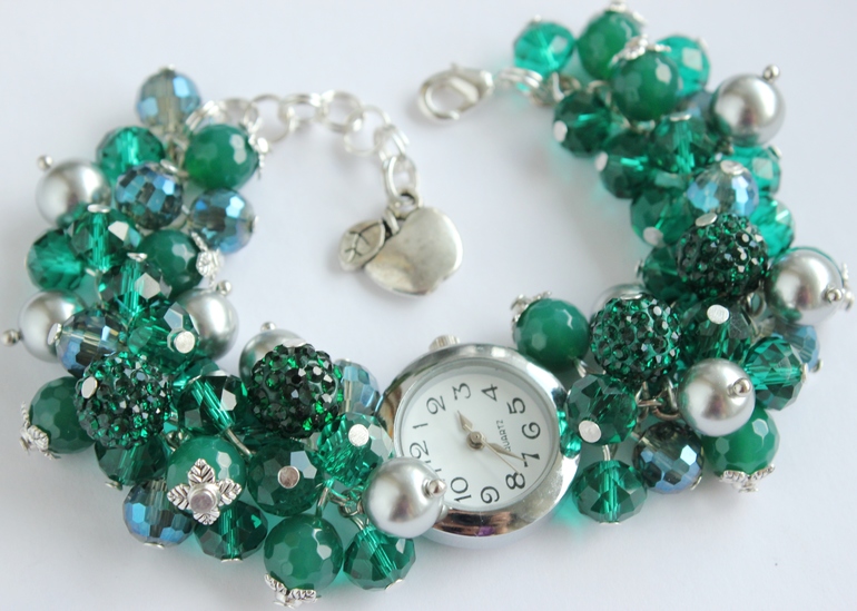 2) Часы "Изумрудные" выполнены из кварцевой часовой основы, гранёного агата, жемчуга майорка,стразовых бусин, гранёных бусин и фурнитуры под серебро.