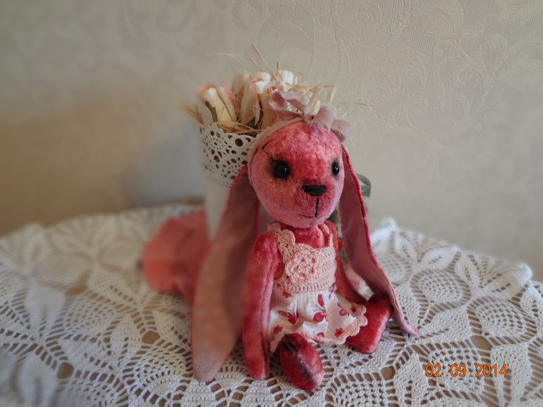 Зайка сшита полностью вручную из винтажного плюша,набита шерстепоном и утяжелена металлическим гранулятом. На шплинтовом креплении. Глазки стеклянные. Зайка ростиком 21см.