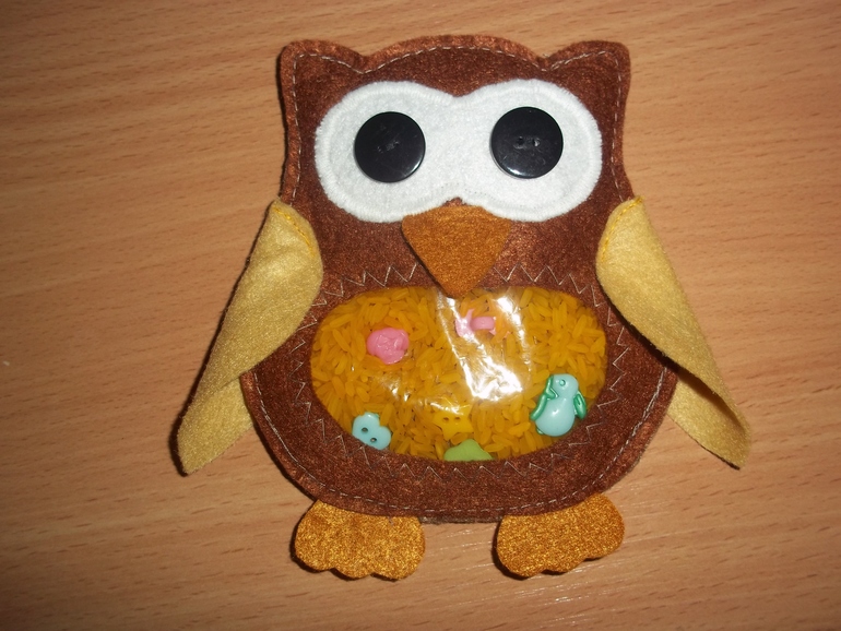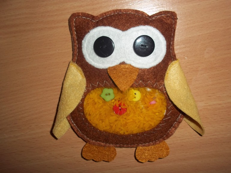 красиво! А с задней стороны тоже фетр? Игрушка же предназначена для тренировки пальчиков, мелкой моторики, а если ткань плотная, то через нее не прощупаешь содержимое, и чтобы найти какую-то деталь просто переворачивать игрушку, перемещая рис? из фетра конечно красиво, солидно и аккуратно, но цель-то в первую очередь развитие моторики. Я как-то шила искалочку и на тыльную сторону использовала просто ситец в два слоя.