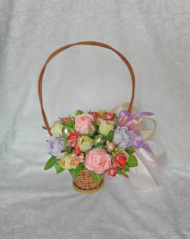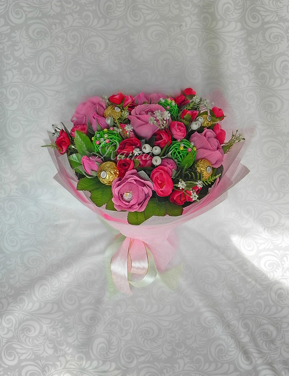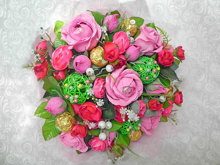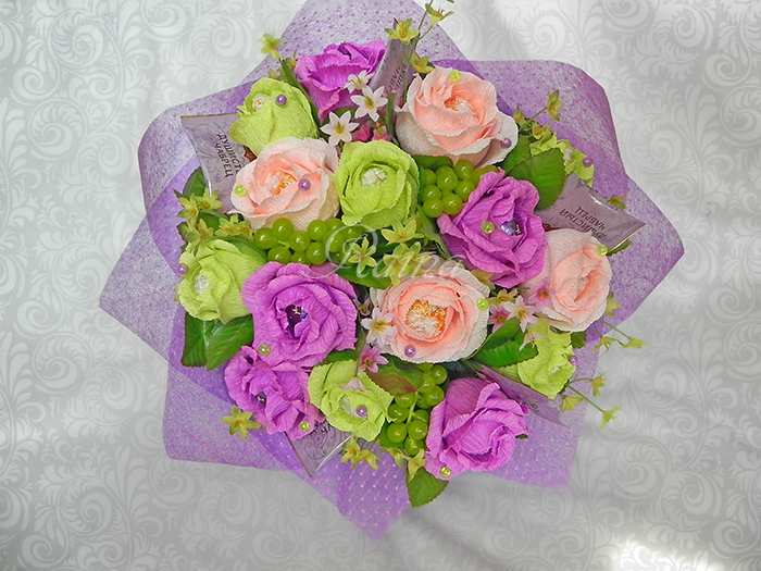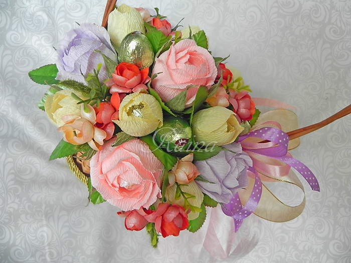 спасибо большое!введите в интернете "розы из гофрированной бумаги мк", много их в интернете. у нет особенного, по которому я делаю. просто на глаз режу и собираю цветок. количество лепестков зависит от размера конфеты, всегда по-разному.