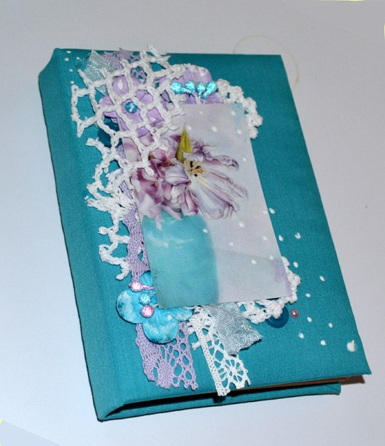 Здравствуйте.Хочу показать вам новый блокнот,родился он по вдохновению и очень мне нравится(не скромно)).Бирюзовый и нежно-сиреневый,много кружева и немного акриловой краски.Полностью ручная работа.