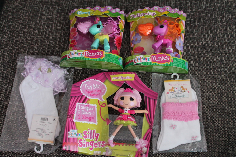 Доченьке. Лалалупси она обожает. Все теперь они с нами будут везде. Любит она такие игрушки в рюкзаке возить. У нас в городе таких не видела. Только больших. Большая у нас есть, но она больше любит такие размеры. Лошадки для лалалупси. Красивущие носочки.