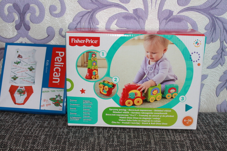 Максимочке поезд - пирамидка Фишер Прайс, такой у нас тоже не было. Сразу стали играть. Максимке понравилось. И комплект нижнего белья. Обожаю эти фирмы.
