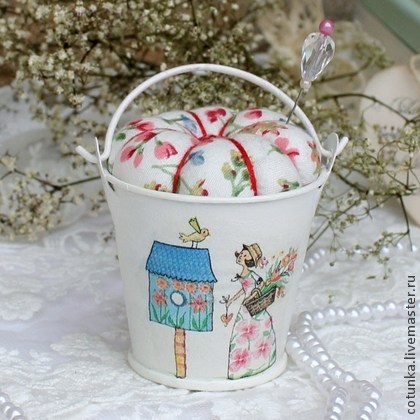О, декупаж такого маленького ведерка... супер!!! Или это рисование?! Стильненько!!! У меня тоже два ведра есть таких, но про игольницу даже не думала, у меня чайники... А смотрится очень даже прикольненько, наверное, возьму на заметку и с девочками сошьём!