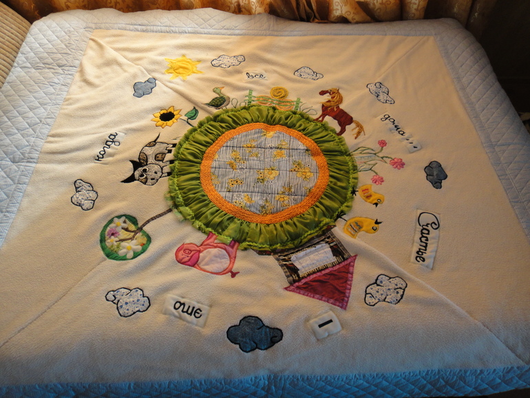 На флисовую основу (та, что белого цвета) нашивала по отдельности каждый элемент. Почти всех животных нашла в интернете. Зеленый центр присборила из... (блин, даже не знаю как называется эта ткань, типа органзы, только дешевле). А потом все это натуральное хозяйство нашила на х/б основу. Не сильна я в названиях тканей.