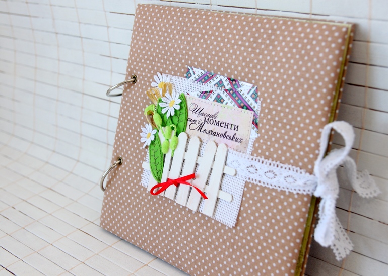 Весь декор для обложки делала сама, заборчик из пивного картона, листики вышивала по фетру, ромашки - кружево в котором вышила срединку!