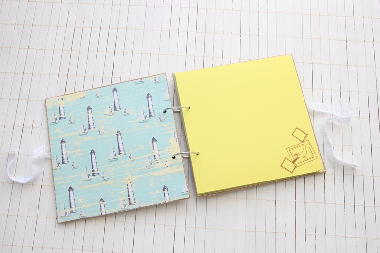 Альбом 22*22 см, обложка из хлопка, внутри яркие листы для фото, украшенные штампиками.
