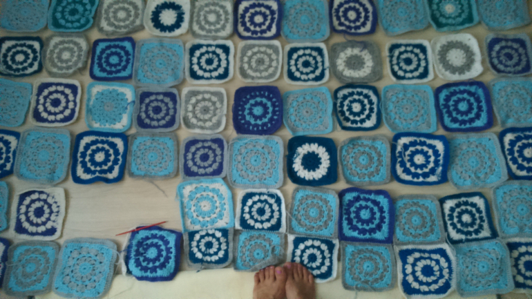 Итоговый размер 175 на 145 см, 11 на 9 квадратов. Пряжа Нако атлантик, Вита Долли в две нити и остатки мохеров в две нити. Крючок №3,5.