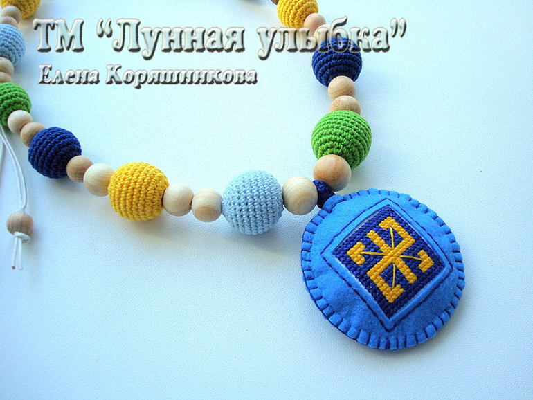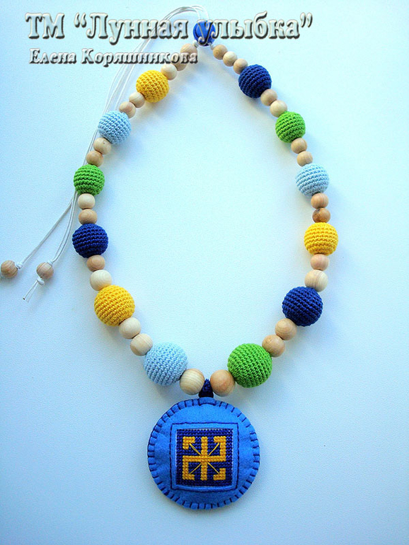 Слингобусы со славянским обережным символом "Радинец". Можжевеловые бусины, 100% хлопок для обвязки, кулон из корейского фетра с вышивкой на канве.