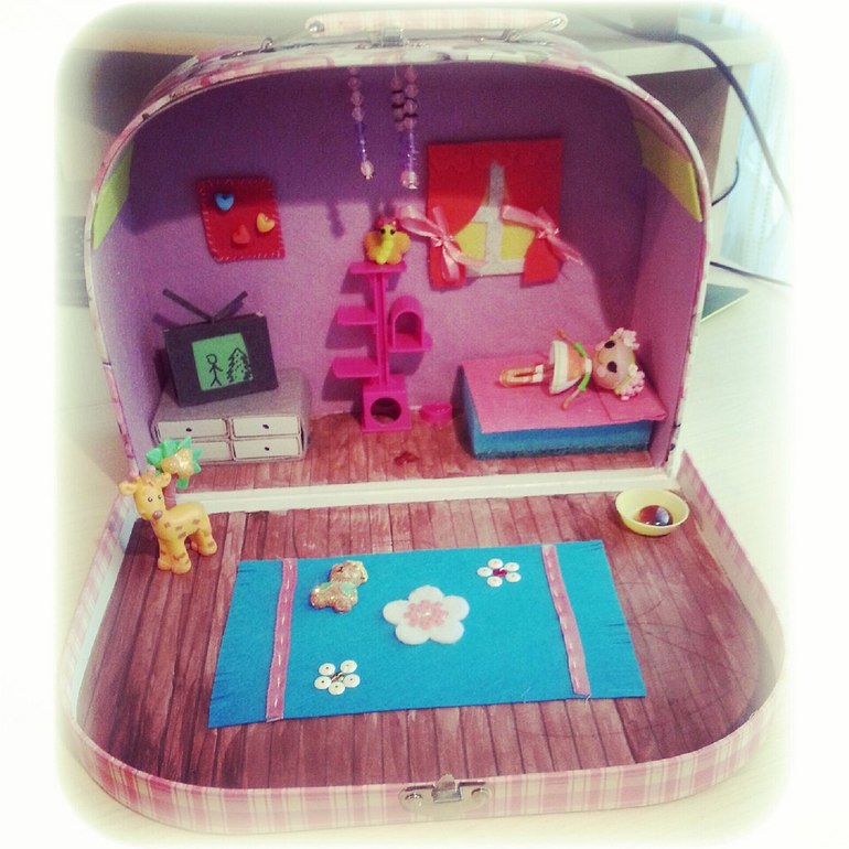 Из старого изрисованного чемоданчика,где хранились карандаши и фломастеры,получился милый и уютный домик. Основной материал фетр+бусины и пуговки. Кроватка- губка для мыться посуды. Тумба и телевизор- спичечные коробки)