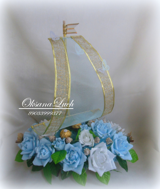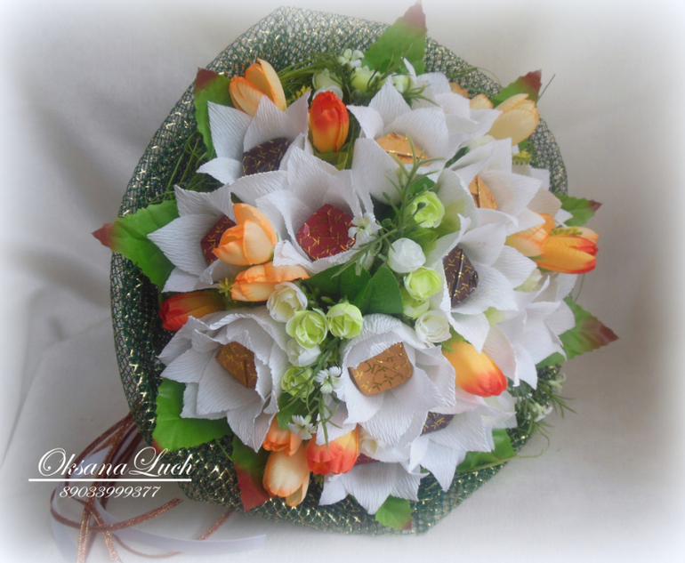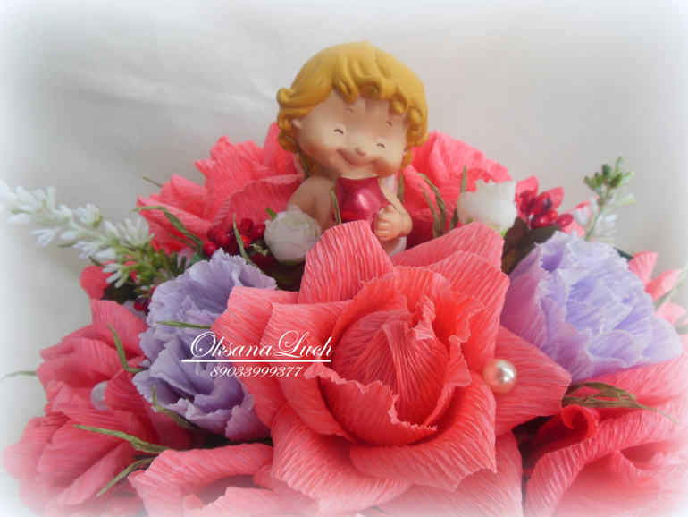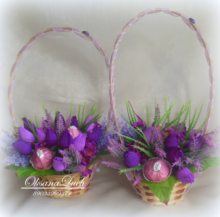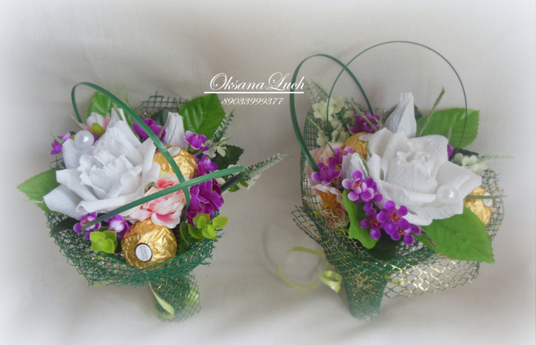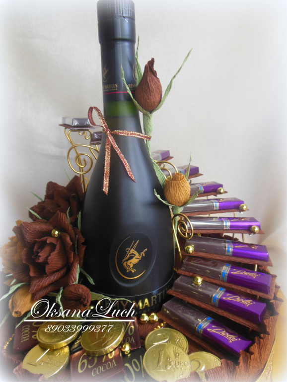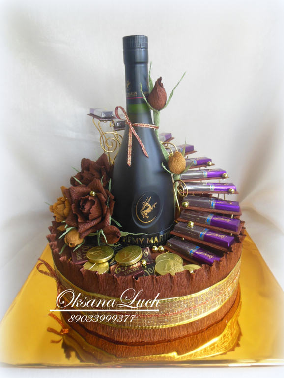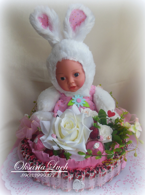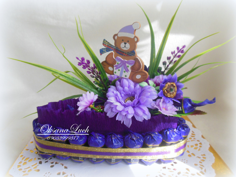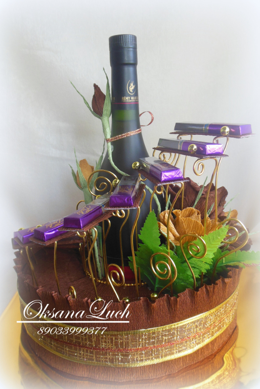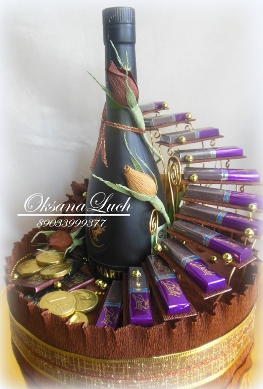Красиво все! Особенно понравился тортик с зайкой и лестница. Только вот в корзине с оранжевыми розами я бы бантик немного попышнее сделала. Оксана, а в коробочке где бутылка стоит тоже конфетки или там пусто?