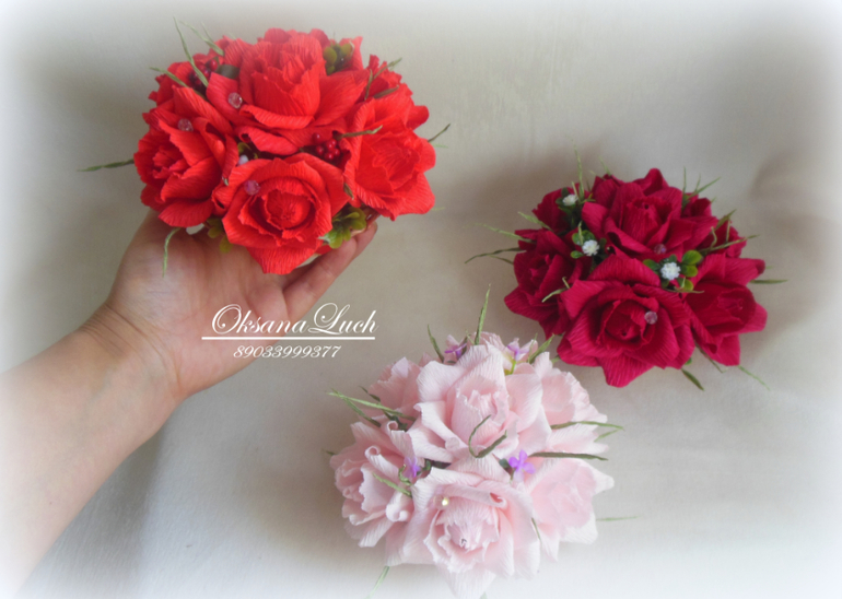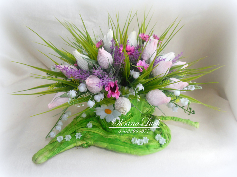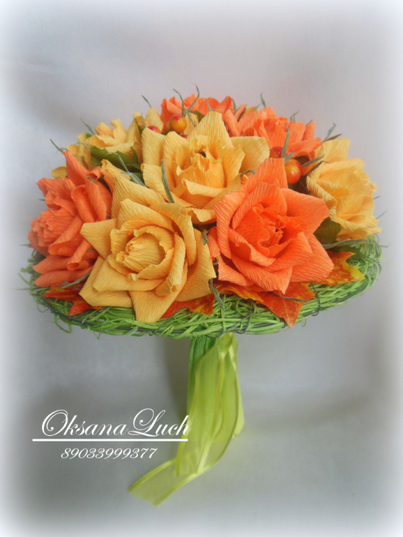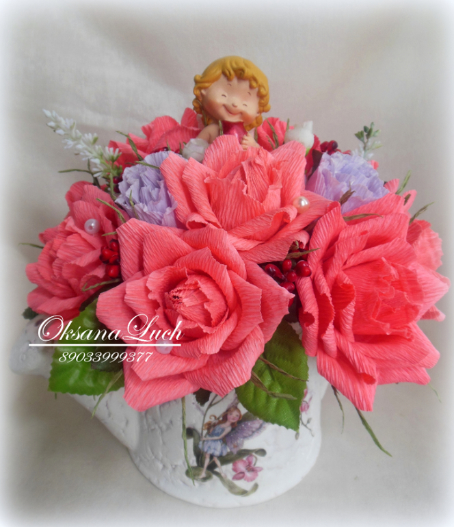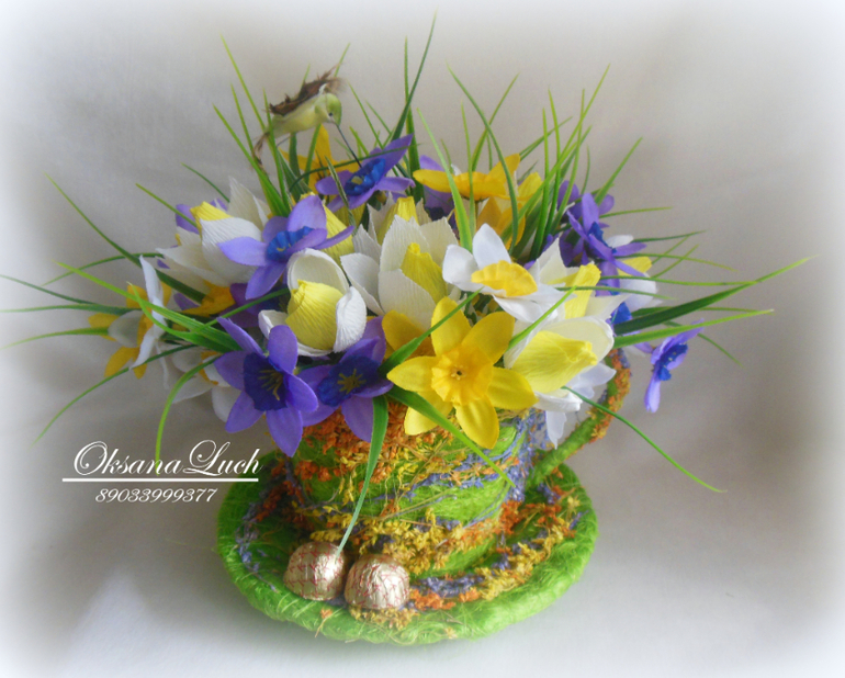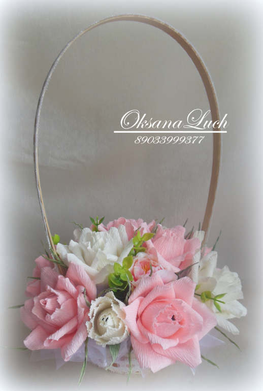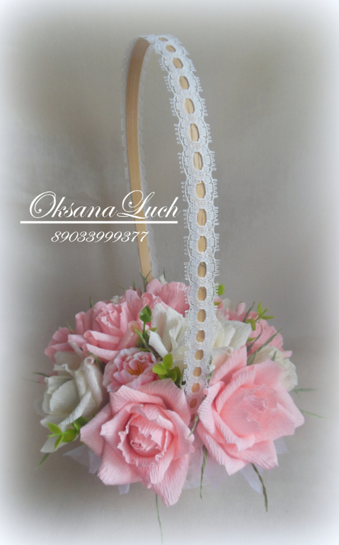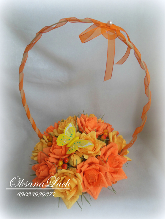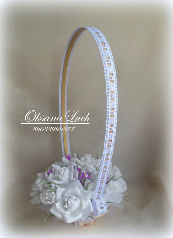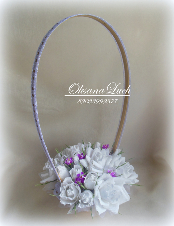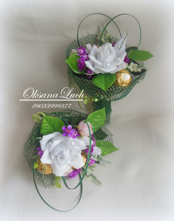 Красиво все! Особенно понравился тортик с зайкой и лестница. Только вот в корзине с оранжевыми розами я бы бантик немного попышнее сделала. Оксана, а в коробочке где бутылка стоит тоже конфетки или там пусто?