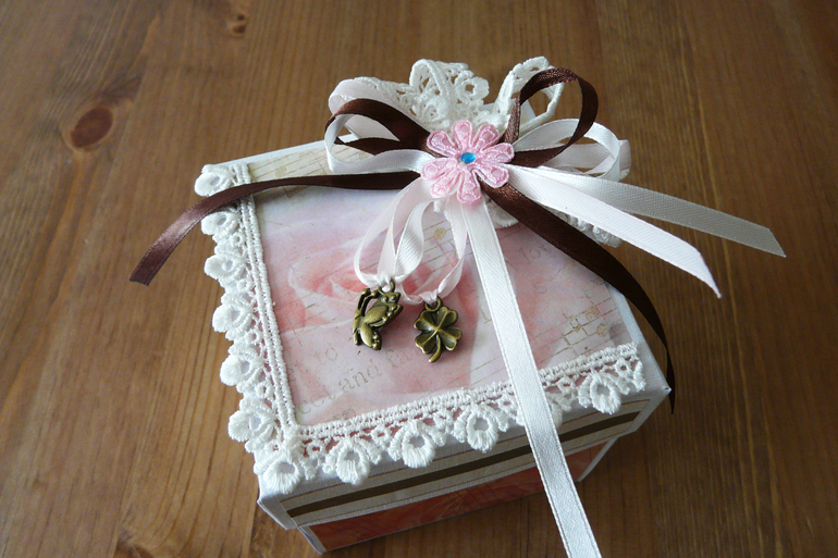 Красивая работа, но я бы вот этот маленький цветочек заменила на что-нибудь иное, он не подходит по цвету( холодный розовый в отличие от тона самой коробочки).