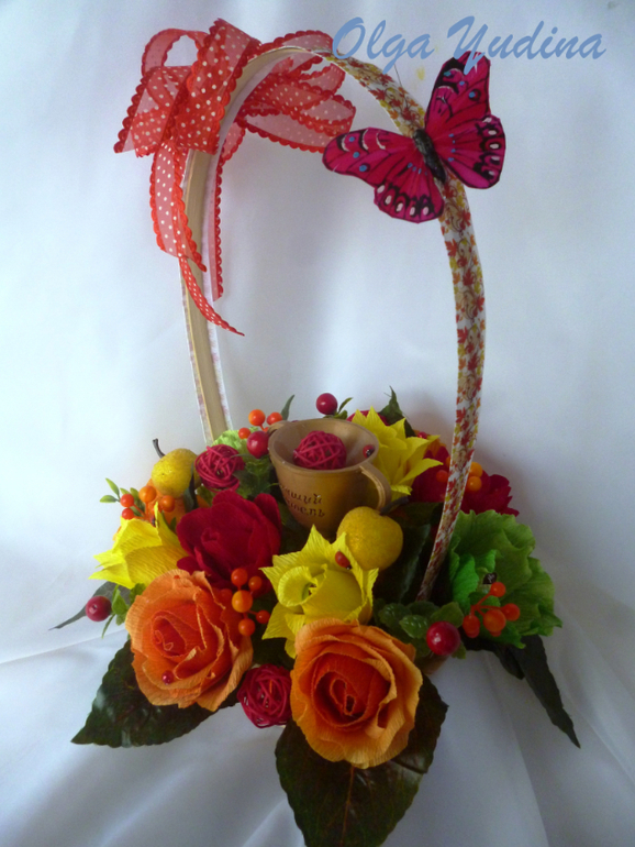 Была у меня корзинка с бордовыми розами,разобрала её и сделала корзинку и ручной с другим цветом в сочетании:
