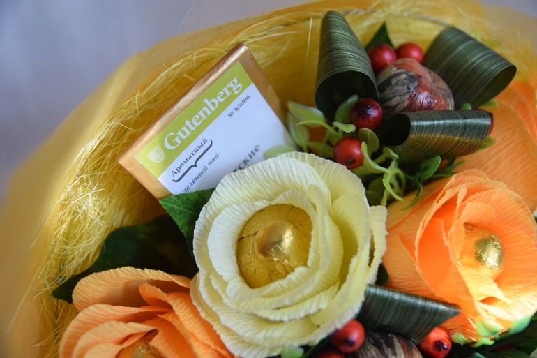 Ого!Очень здорово и необычно!А то сейчас все только цветы, фрукты или мягкие игрушки в букетиках(А, оказывается, и чай можно!!Супер!