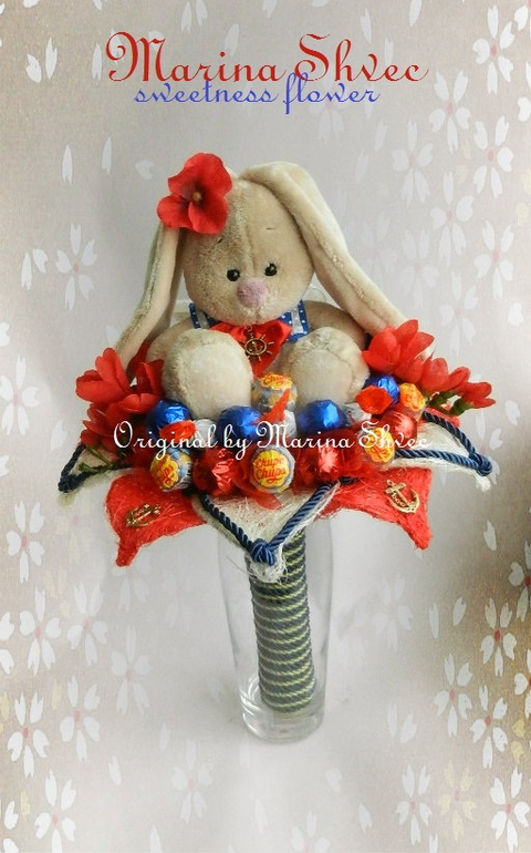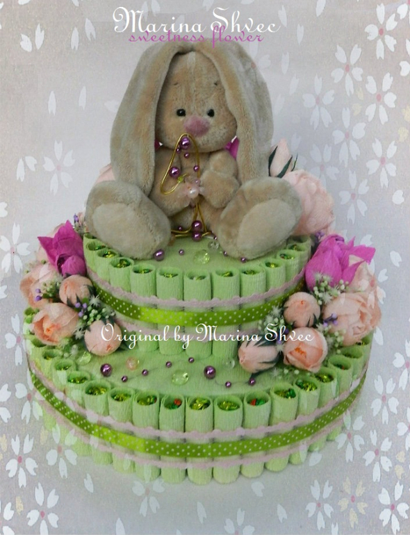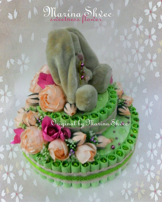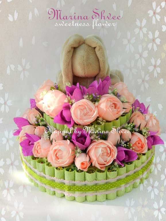 Привет! Марина, красота опять! Букетик очень стильный! Про тортик, на мой взгляд вперед банты, сзади цветы или бусы.