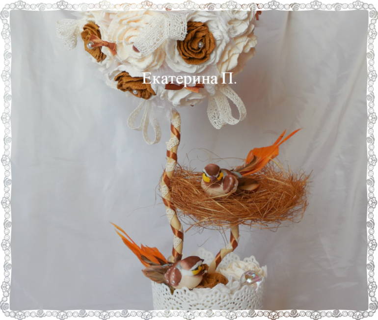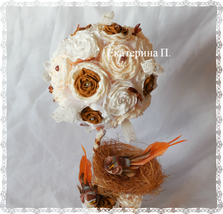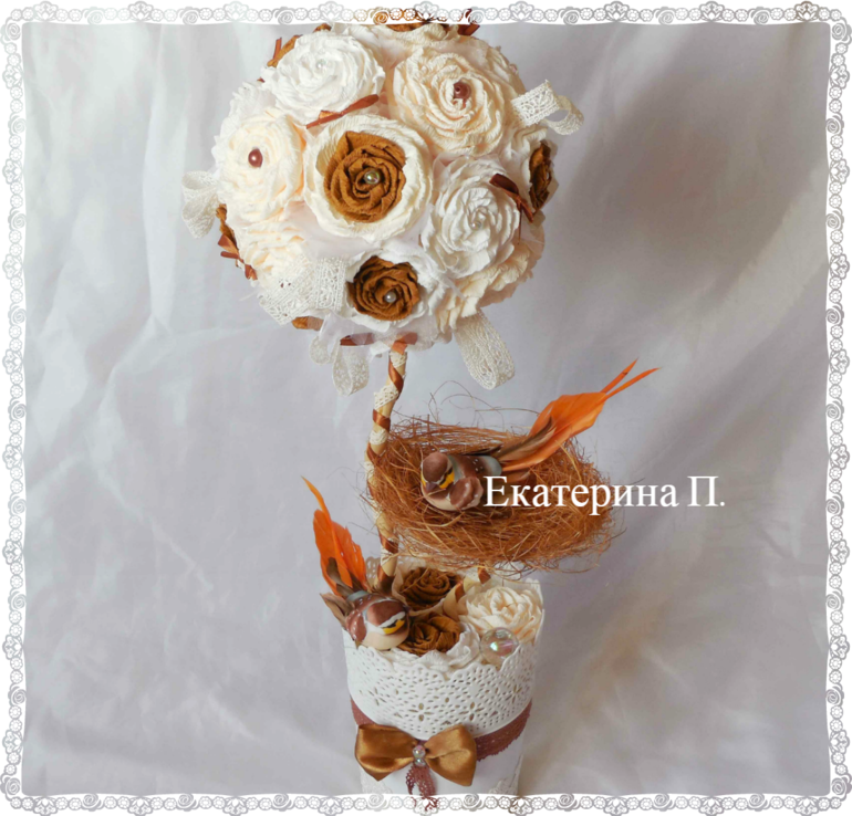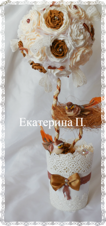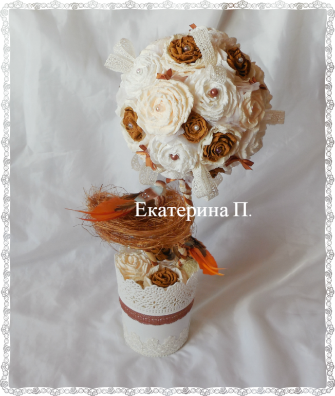 Катюша мне очень понравилось и сочетание цветов и исполнение. Я вот когда смотрю на топиарии они для меня живые или не живые ( вот такое у меня может странное видение), вот твой живой!. Розочки у тебя такие своеобразные! Знаешь все их "крутят" по разному, думаю и у тебя будет тоже весьма интересно, когда руку набьешь! Ну мне так кажется!