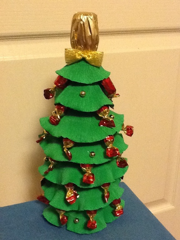 Может кому пригодится идея елки! К сожалению фото только самой первой, остальные 2 были съедены слишком быстро((( в следующих работах под нижний слой уже добавляла трюфели и елка к низу не становилась уже. Девочки если вы делали что-то подобное поделитесь! В этом году хочу еще сделать, все же коробка конфет и бутылка шампанского в пакетике это не подарок, а так уже намного веселее!
