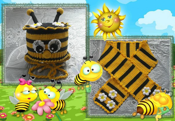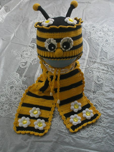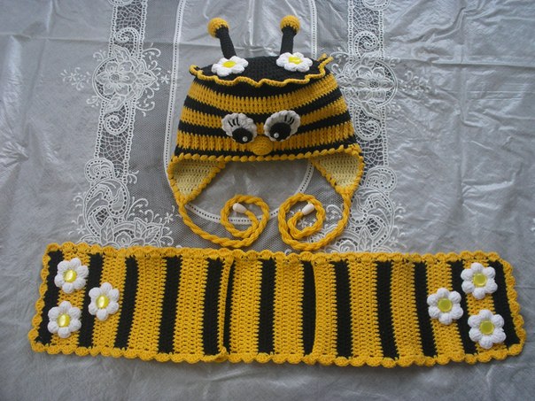 Комплект "Пчелка"для девчушки 2 годика на осень крючком связан из джинса,шапочка двойная(подклад из Беби вул),шарф 12*100 см,шапочка на о.г.48 см.За идею огромное спасибо TIM).Прошу под кaт,много фото)