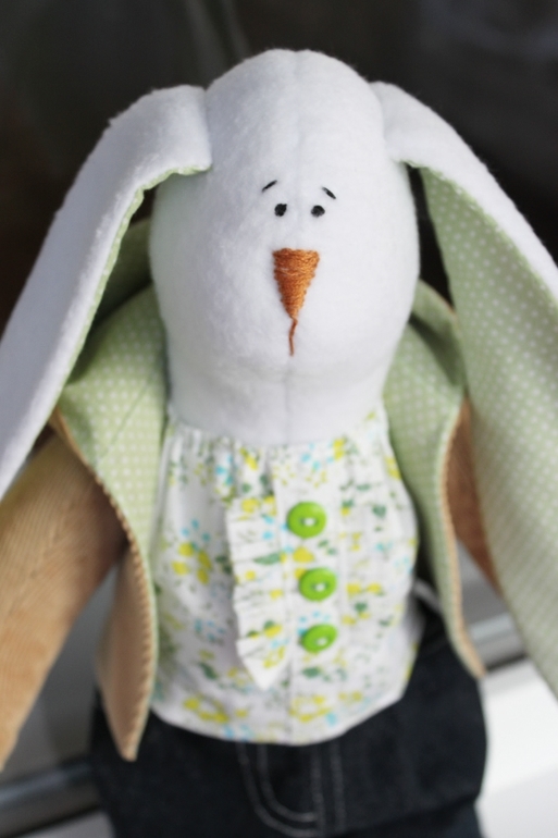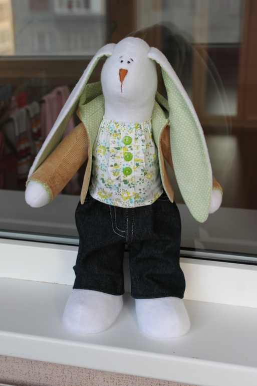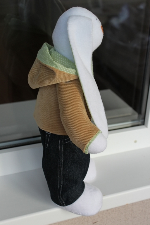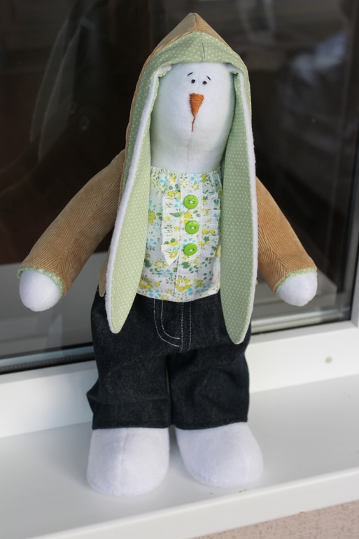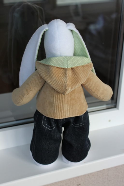 Выкройку, к сожалению, дать не могу. Я ее сама нарисовала, на глаз и потом выкинула. Потому как мне штаны не понравились, как сидят. Я вот сейчас собираюсь шить девочку-зайку, и такие шаровары ей совершенно не пойдут. Я вот как раз роюсь в интернете по поводу штанов. Вот нашла такой МК http://www.livemaster.ru/topic/80033-sozdanie-vykrojki-bryuk-i-ih-poshiv-individualno-dlya-kazhdoj-igrushki-po-ee-razmeru?msec=68. Мне кажется, очень понятный. По крайней мере, я по нему буду шить следующие. Ведь все игрушки разные размерами, нужно шить для каждого индивидуально. А тут все по меркам! И еще и Натальи Костиковой в блоге есть бесплатный МК по пошиву брючек. Тоже все понятно. Что касается отделочных строчек... Сначала "карманы" и "гульфик" (все обманка) отстрочила, потом стачала боковые швы, отстрочила, затем передний и задний шов, отстрочила, подвернула низ и верх, затем шаговые. Что мне не понравилось? То, что в поясе уж ооочень широкие получились. А так как джинса очень толстая, то просто стянуть нить на поясе не спасало. Пришлось пришивать потайными стежками к туловищу. А мне так не нравится. Я хотела, чтобы штаны сами по себе сидели на талии, ну по фигуре были. Жалко, что я раньше не нашла этот МК.